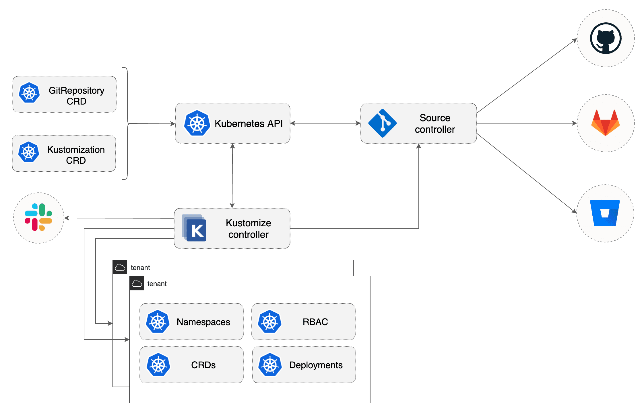- Reconciles the cluster state from multiple sources (provided by source-controller)