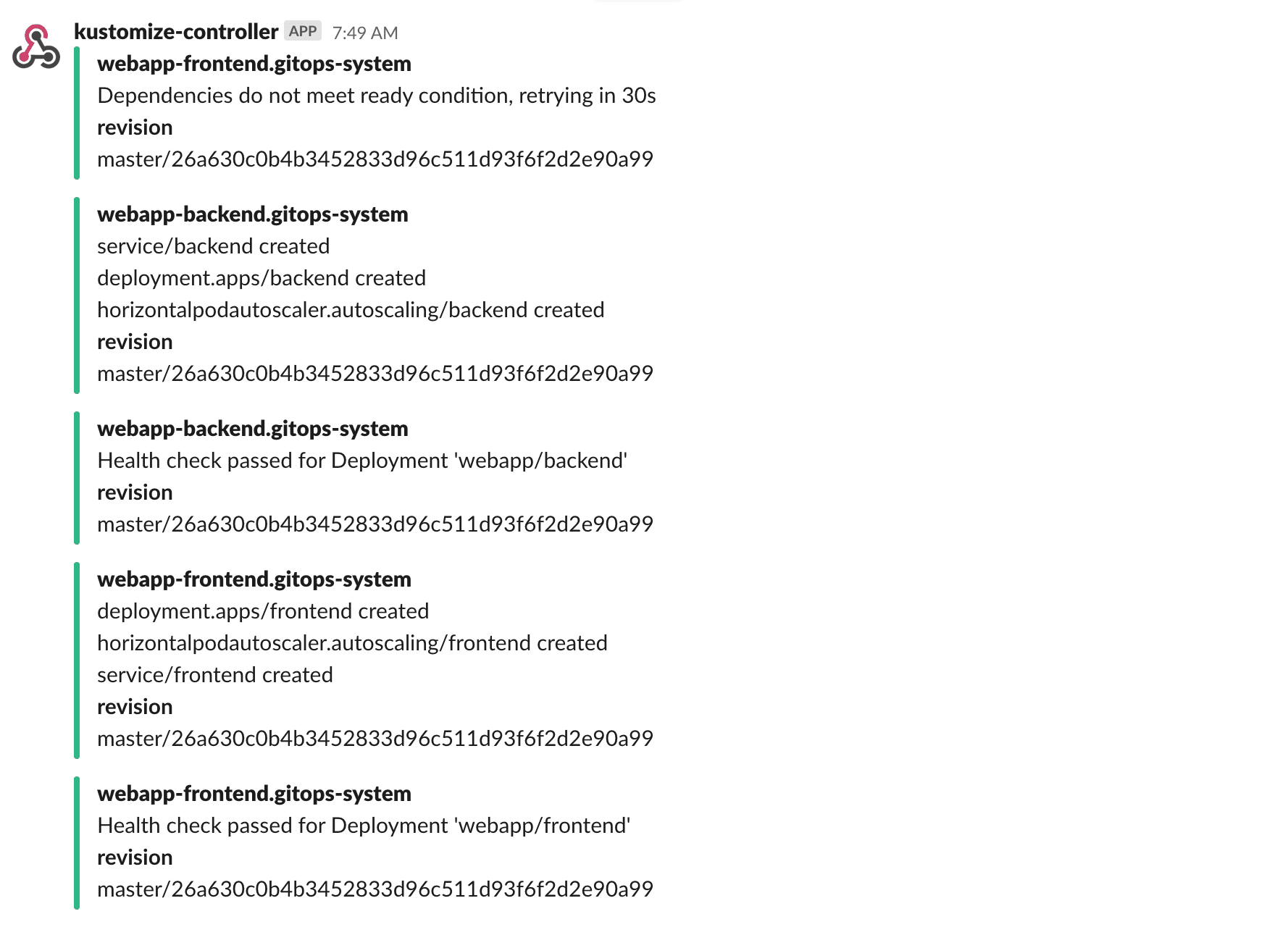 Receiving an event in the form of a commit status rather than a message in a chat conversation has the benefit that it closes the deployment loop giving quick and visible feedback if a commit has reconciled and if it succeeded. This means that a deployment will work in a similar manner that people are used to with "traditional" push based CD pipelines. Additionally the status can be fetched from the git providers API for a specific commit. Allowing for custom automation tools that can automatically promote, commit to a new directory, after receiving a successful commit status. This can all be done without requiring any access to the Kubernetes cluster.